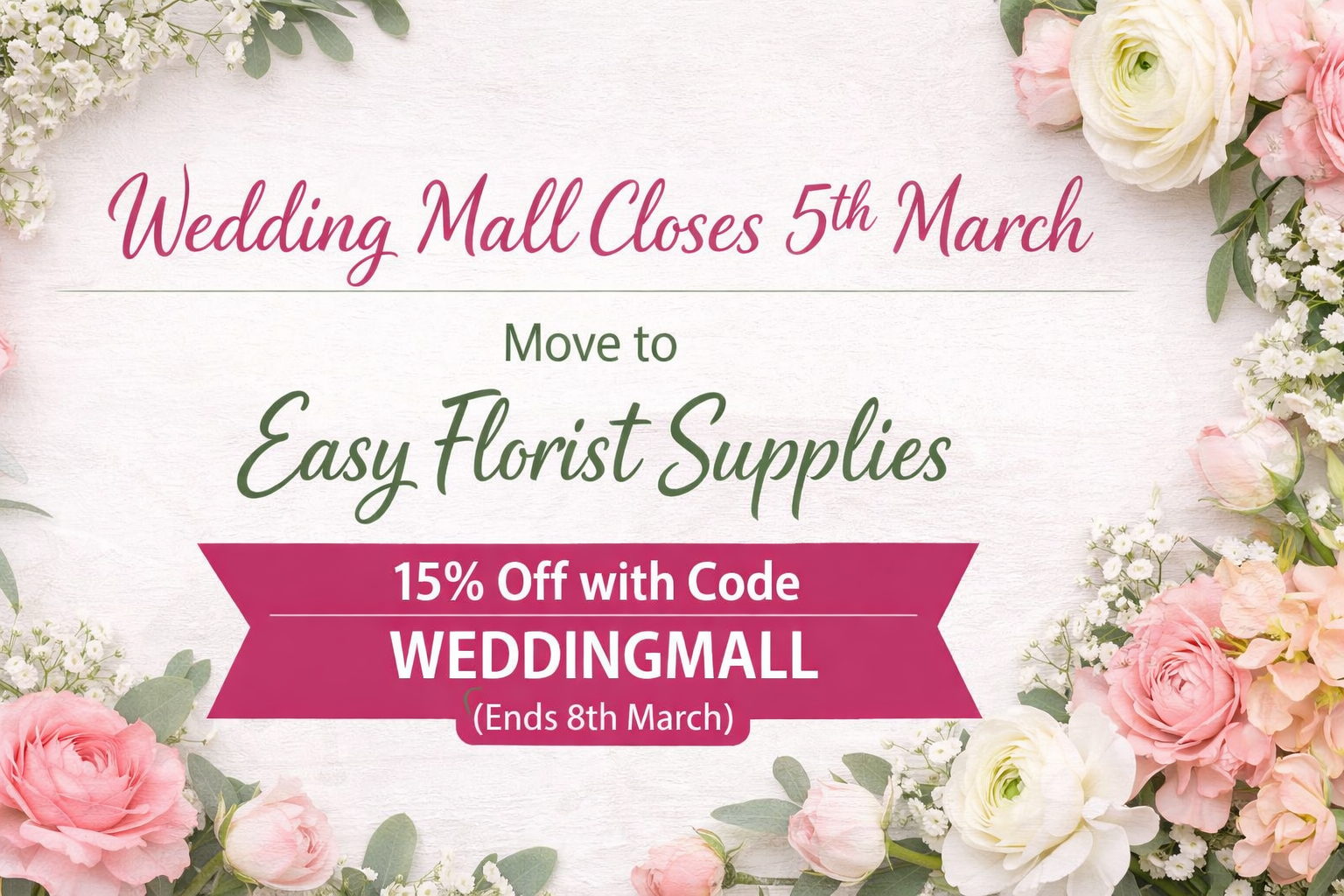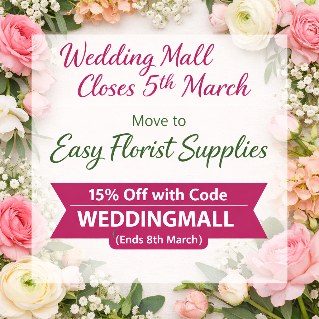 If you have already placed an order with us, don't worry this is all being processed and Wedding Mall will start open until the end of March for any customer queries or help. After that you can always contact the team at Easy Florist Supplies for any help. As always, you’re fully covered. All UK Shopping Mall terms and conditions around returns, refunds and order support remain exactly the same across our brands — and our team is here whenever you need us.