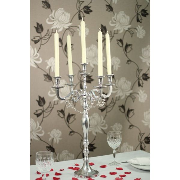 | 4 | Now that the candelabra is on the table complete with candles, its time to hang the acylic garland. This is simply draped over the arms. There are lots of different types of garlands available including pearls and larger beaded garlands. the same principle applies in hanging the garland and you can pick one to match the theme of your wedding.