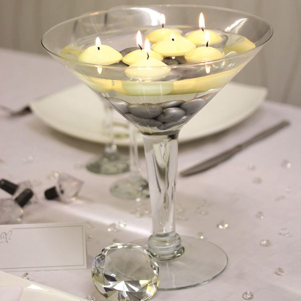 | 4 | Now its time to add the candles. I have used seven ivory floating candles in this display. They fit perfectly in the martini which has a cup diameter of about 23cm. The key point to note here is that you want to leave some space so that the candles can move around in the bowl, rather than having the candles tightly packed together. We wont light the candles until just before the event. |