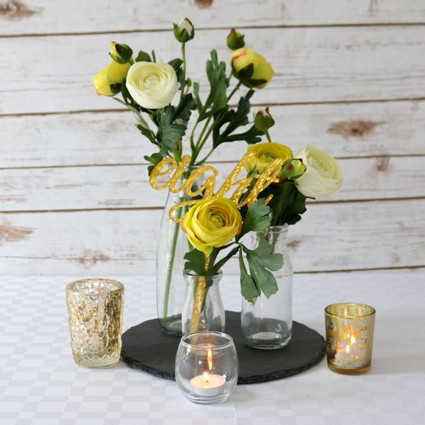 | 5 | Just one stem of yellow rannunculus cut to size and the table number pick are left to be added to the mini bottle. |