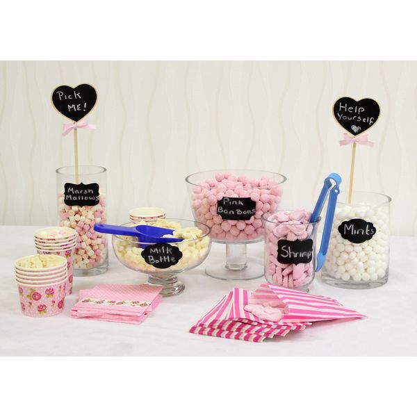 | 3 | Label up the vases Use the chalboard stickers that include a handy pack of chalk to label the vases. These chalkboard stickers are great as they peal off and are easy to stick onto any surface flat or round. A great alternative to having paper cards dotted around. I've also used these heart shaped blackboards to add a couple of welcome 'Please Help Yourself' notes |