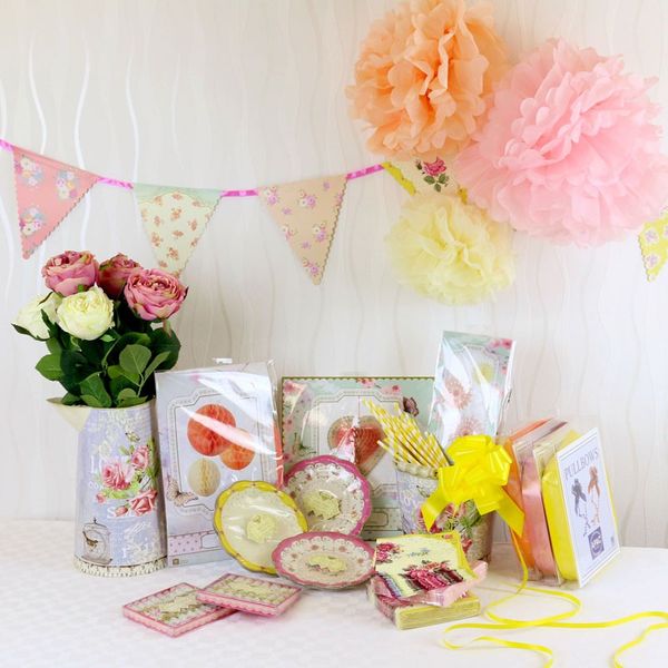 SummaryA beautiful pack of summer wedding decorations. From hanging pom poms and honeycombs to floral jugs and plates on the table, you have everything you need to start off a floral themed wedding. The stunning floral designs and muted peach pastel colours help give a real impact to any wedding.