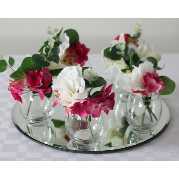 | 3 | Place the 5 glass vases equally around your mirror plate. We used 5 roly poly candle votives as our mini vases, the round shape compliments the round mirror plate and they're dainty and cute enough to hold a small posy. Add your little flower bundles. You may need to snip them down a little at this point to fit. |