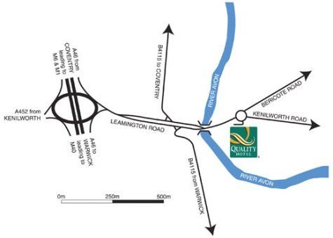 Leave M6 at exit 2 and join A46. Follow signs for Warwick. Look for slip road signposted Kenilworth and Leamington Spa A452. Continue along the A452 towards Leamington Spa and the Hotel is on the right.