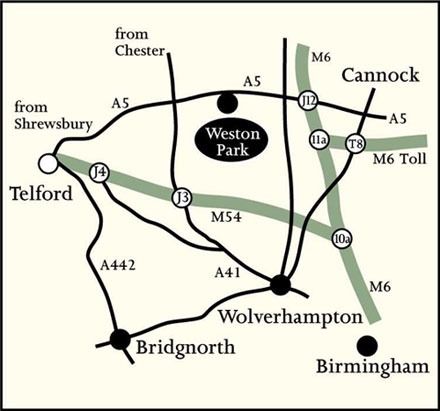 Directions by car: Weston Park is situated on the A5 at Weston-under-Lizard, just 30 minutes from Central Birmingham 3 miles off M54, Junction 3 & 8 miles off M6 Junction 12.